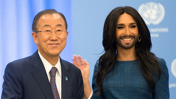 Генеральный секретарь ООН Пан Ги Мун принимает Кончиту Вюрст, ноябрь 2014 года