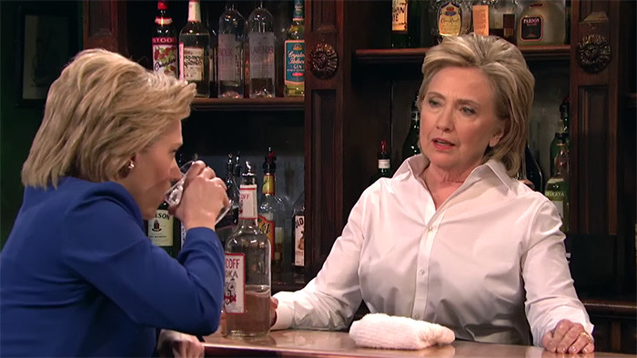 В последние недели Клинтон уличили в некоторой нерешимости по ряду вопросов прав человека для ЛГБТ, основываясь на ее переписке, ставшей достоянием гласности. В вечернем шоу за стойкой бара, она символически обслуживала саму себя, которую играла открытая лесбиянка актриса Кейт Маккиннон.