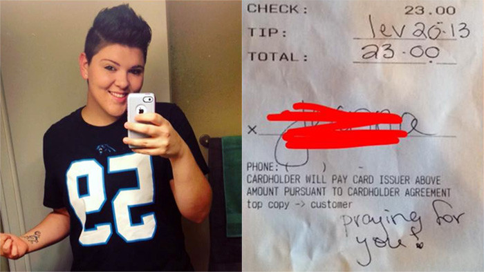 Александра Джад (Alexandra Judd), гей-официантка из Северной Каролины, поделилась в своем "Фейсбуке" изображением чека, на котором в строку для чаевых была вписана ссылка на гомофобные стихи из Ветхого Завета.