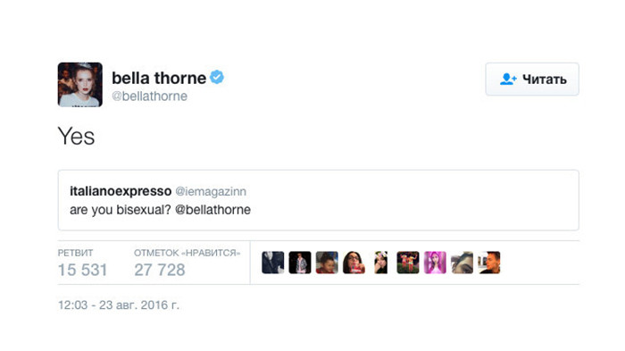 18-летняя американская актриса Белла Торн (Bella Thorne) рассказала о том, что она бисексуальна. Девушка совершила камин-аут в Twitter, отвечая на вопрос поклонника.