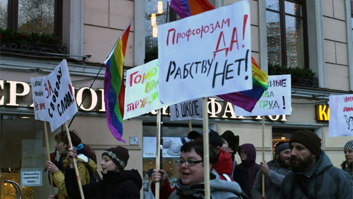 Участники акции прошли по Невскому проспекту с радужными флагами и плакатами - "Сокращайте чиновников, а не врачей", "Профсоюзам - да, рабству - нет", "За равные права на труд", "За свободу слова", "Против попов в школе", "Женщина не "половинка"... Звучали лозунги - "Свобода не требует согласований", "Гомофобия - враг трудящихся". Акция закончилась небольшим митингом в Екатерининском саду.