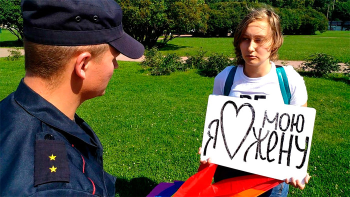 Известно также и об одной активистке, которая была задержана полицией после одиночного пикета с плакатом "Я люблю свою жену". Юридическую помощь задержанной оказывает юрист ЛГБТ-группы "Выход".