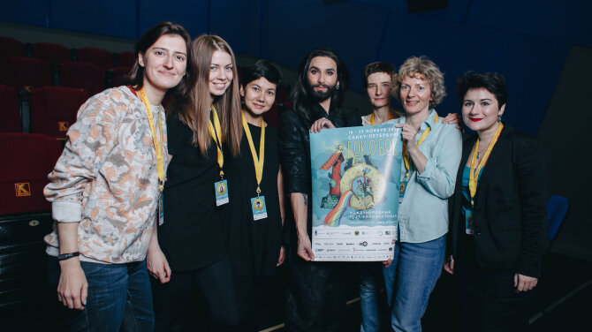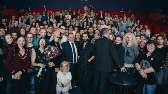 Едва закончился фильм, на сцену под громовые аплодисменты поднялась Кончита Вюрст - певица, победительница конкурса "Евровидение-2014" и общественная деятельница, избранная глобальным послом ЛГБТИК-сообщества. Бородатая дива, чей образ придумал и воплотил австрийский травести-артист Томас Нойвирт, ответила на множество вопросов зрителей и журналиста Федора Дубшана. Среди много, о чем рассказал/а Кончита-Томас, - восхищение Россией и Петербургом, мысль о том, что сегодня невозможно не поддерживать феминизм, а также обещание, что если образ Кончиты после второго альбома будет "убит", то это будет прекрасный и драматичный финал.