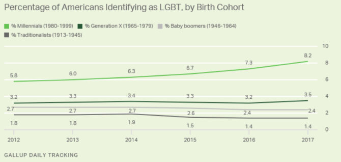 Движущей силой ЛГБТ-волны является поколение миллинеалов - родившихся между 1980 и 1999 годами. В нем с 2016 года наблюдается однопроцентный рост идентифицирующих себя как часть ЛГБТ-сообщества (с 7,3% до 8,1%, в 2012 - 5,8%).