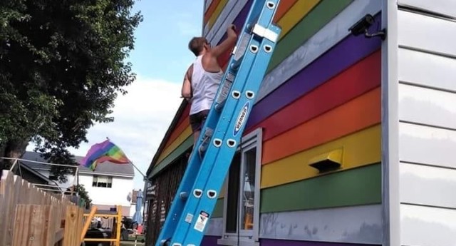 Но соседи пожаловались на них в муниципалитет. И тогда Лиза и Шерри решили нанести добивающий удар. Вместе с друзьями они перекрасили в цвета ЛГБТ-флага стену дома, которая выходит на сторону гомофобов.