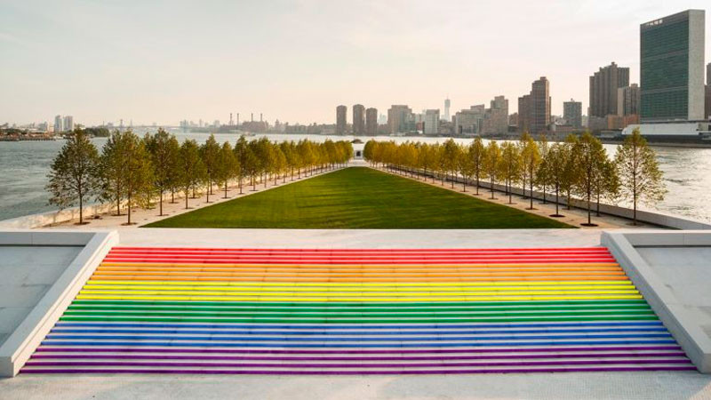 В рамках Мирового Прайда в Нью-Йорке главная лестница Парка четырех свобод Франклина Рузвельта превратилась в грандиозный ЛГБТ-флаг.