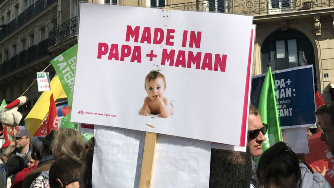 Представители французских консервативных и католических организаций прошли маршем по центру Парижа, протестуя против нового законопроекта о биоэтике, который в случае принятия позволит одиноким женщинам и лесбиянкам получить бесплатный доступ к искусственному оплодотворению (ЭКО).