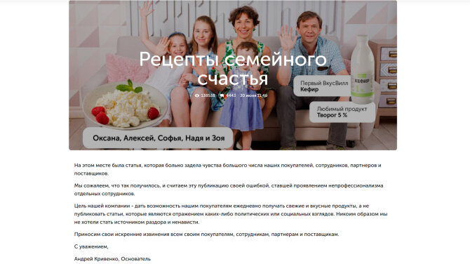 "ВкусВилл" удалил рекламную статью о покупателях, среди которых была квир-семья. Публикация названа "ошибкой", ее авторы "непрофессионалами". "ВкусВилл" не просто извинился, а разместил фото семей, состав которых соответствует гомофобным законам России. Они приветливо машут нам ручками...