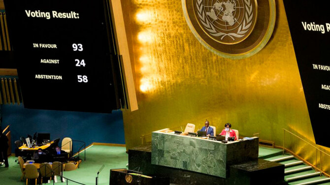 Предложенную Украиной в соавторстве с 58 странами резолюцию поддержали 93 государства. 24 делегации выступили против, и 58 воздержались. Резолюция называется "Приостановление прав Российской Федерации, связанных с членством в Совете ООН по правам человека".