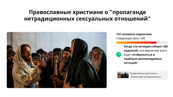 "Не важно, как мы, будучи православными христианами, относимся к ЛГБТ-людям, важно то, что введение новых репрессивных законов от нашего лица без нашего на то согласия - неприемлемо", - говорится в петиции.