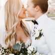 На церемонии Роуз была одета в сшитый на заказ костюм мужского бренда "Indochino", а Имон - в платье от Galia Lahav. Гостей попросили прийти в черном, чтобы сохранить черно-белую тему свадьбы: новобрачные были в белом.