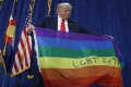 Дональд Трамп вышел к избирателям с радужным флагом с надписью "ЛГБТ за Трампа"