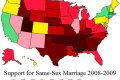После разрешения однополых браков в отдельных штатах США их поддержка резко идет вверх. К такому выводу пришел специалист по электоральной географии Александр Киреев, результаты анализа статистики он представил в своем блоге. "Исследователи собрали данные опросов по штатам об отношении к однополым бракам за 1994-1996...