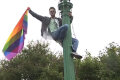 [ВИДЕО] В Санкт-Петербурге задержан активист, водрузивший радужный флаг на фонарный столб
