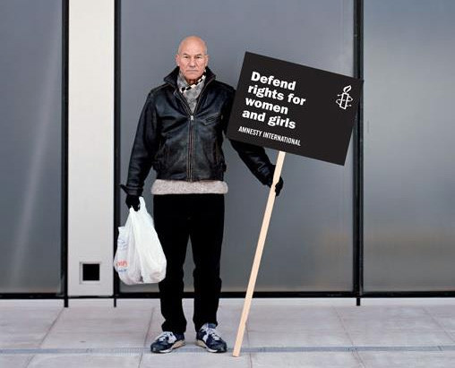 Феминист сэр Патрик Стюарт, знаменитый британский актер, с плакатом "Защитим права женщин и девочек"
